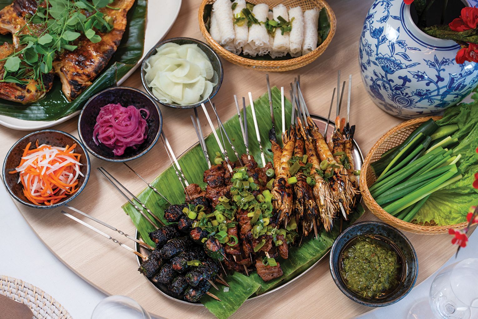 Serve the skewers hot with fresh herbs, pickles, rice noodles or steamed rice, and a wedge of lime.