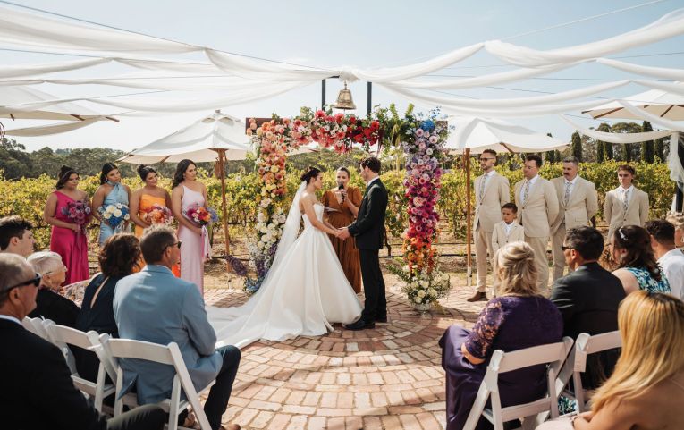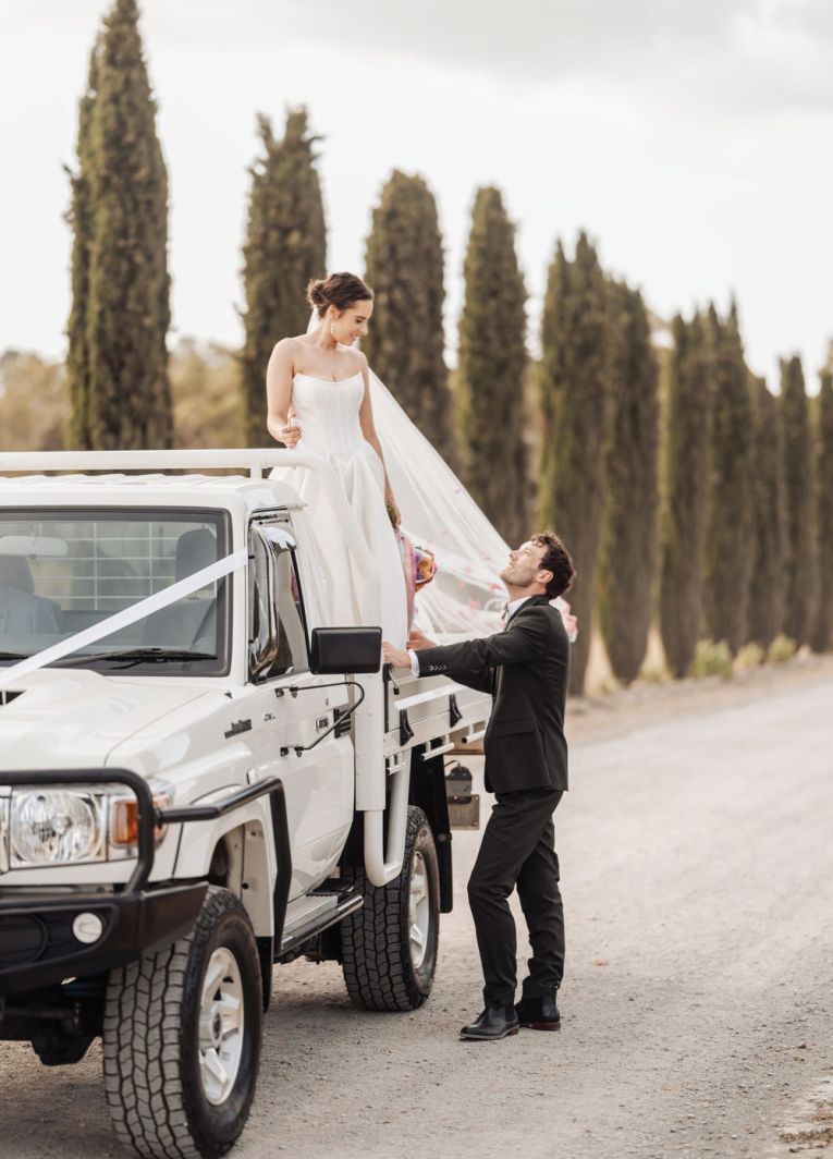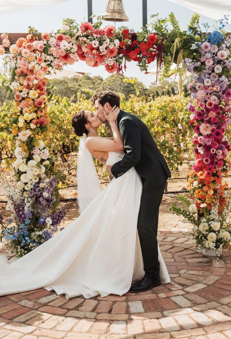 For their big day, the bride wore a veil that has been in Nathan’s family for more than 60 years, previously worn by both his mother and grandmother. It was then hand-embroidered especially for Brydie. Nathan said his bride was stunning. “Seeing Brydie walk down the aisle was an unforgettable moment,” Nathan says. “I felt this huge wave of relief – and was completely stunned by her dress. She’d led me to believe it would be something totally different, so it was a real surprise … and she looked absolutely incredible.” Brydie says a quiet moment shared together was beautiful. “We just took it all in – the colours, the laughter – and reflected on what had just happened. We were married!”.